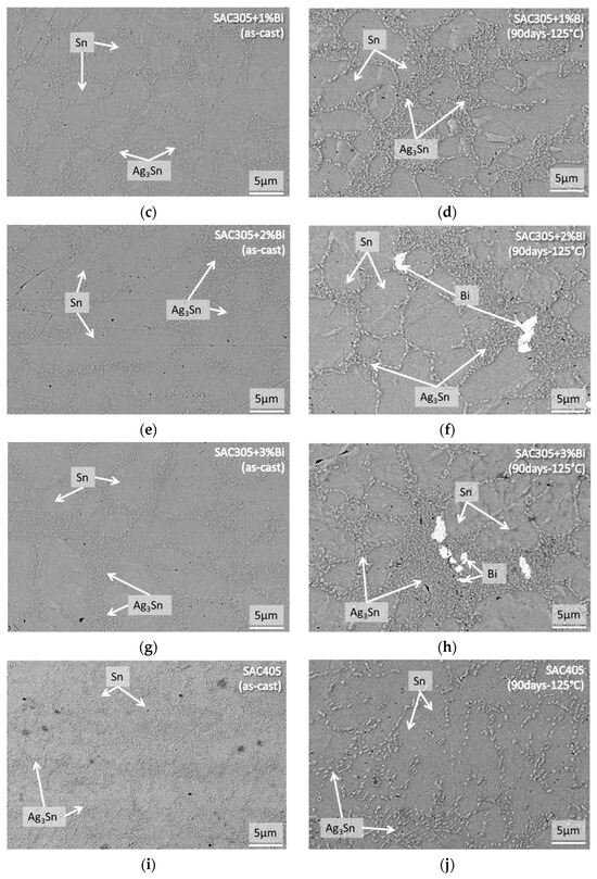 SEM backscattered electron micrographs of (a) as-cast SAC305, (b) aged SAC305 (90 days, 125 °C), (c) as-cast SAC305 + 1 wt.%Bi, (d) aged SAC305 + 1 wt.%Bi (90 days, 125 °C), (e) as-cast SAC305 + 2 wt.%Bi, (f) aged SAC305 + 2 wt.%Bi (90 days, 125 °C), (g) as-cast SAC305 + 3 wt.%Bi, (h) aged SAC305 + 3 wt.%Bi (90 days, 125 °C), (i) as-cast SAC405, (j) aged SAC405 (90 days, 125 °C), (k) as-cast SAC405 + 1 wt.%Bi, (l) aged SAC405 + 1 wt.%Bi (90 days, 125 °C), (m) as-cast SAC405 + 2 wt.%Bi, (n) aged SAC405 + 2 wt.%Bi (90 days, 125 °C), (o) as-cast SAC405 + 3 wt.%Bi, and (p) aged SAC405 + 3 wt.%Bi (90 days, 125 °C).