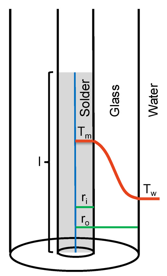 where m represents the mass of the solder, c is the specific heat capacity of the solder, and dT is the differential temperature drop in the solder during dt. The energy loss by the solder is equivalent to the heat transferred through the glass tube. The heat transferred by a cylindrical tube over time dt is given by Equation (11) [40]: