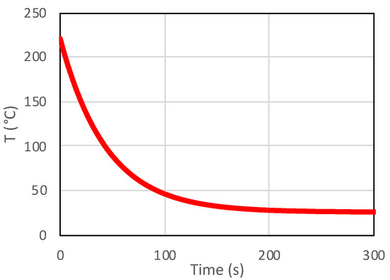 Values of the constants used in Equation (16) for calculating the solder temperature are as follows: sample length (l) of 50 mm, inner radius (ri) of 1.5 mm, outer radius (ro) of 7.5 mm, thermal conductivity of glass (k) of 1.15 W/mK, density of solder of 7.49 g/cm3 (for calculating m), specific heat capacity of solder (c) of 0.232 J/gK, and water bath temperature of 25 °C, and the melting temperatures of solder (Tm) used in this study are between 220 °C and 230 °C. The temperature versus time plot is shown in Figure 6 for Tm = 220 °C. For all solders, the cooling rate in the beginning 20 s of ramp-down was found to be between 3.5 °C/s and 3.7 °C/s, which is comparable to the cooling rate used in the solder reflow process. This analysis confirms that the cooling rate experienced by the samples is comparable to the cooling rate in a typical solder reflow process, ensuring that the microstructures and thus the properties of the samples are similar to the solder joints used in applications.