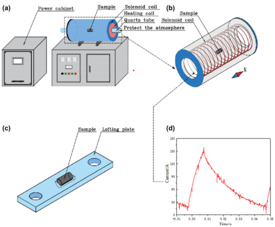 Schematic diagram of the pulsed magnetic field test device adapted from [18]: (a) power cabinet and tubular furnace main body, (b) spiral coil schematic diagram, (c) sample and discharge sample, and (d) pulsed magnetic field waveform diagram.