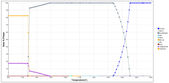 The solid−liquid coexistence zone for the materials used in this test was calculated using JMatPro simulation to be between (1450~1345) °C, as illustrated in Figure 4. The calculation results indicate that the temperature range of the solid-liquid coexistence zone exceeds 100 °C. Consequently, there is a higher likelihood of forming coarse dendritic segregation and large undissolved carbides.