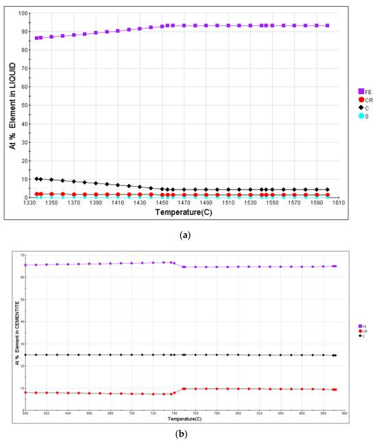As depicted in Figure 5a, the liquid phase of GCr15 used in the test consists of approximately 95% Fe and around 1.5% Cr. Furthermore, as shown in Figure 5b, the composition of Fe in M3C ranges from 80% to 85%, while the Cr constitutes about 10% to 20%. With increasing temperature, the Fe content in the carbide gradually decreases, and the Cr content rises. The continuous replacement of Fe by Cr in M3C results in the formation of alloy carbide (Fe, Cr)3C.