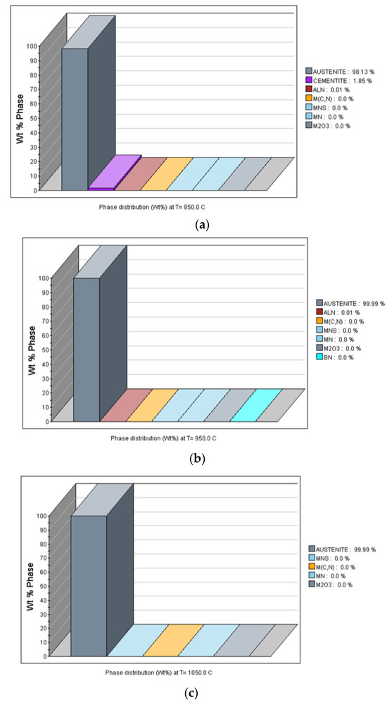 Proportion of different phases in the alloy at different temperatures. (a) at 850 °C, (b) at 950 °C, (c) at 1050 °C.