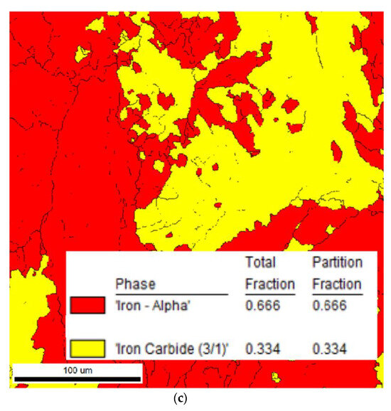 Figure 6 illustrates the results of the phase ratio calculations in the alloy at various temperatures and the percentage of undissolved carbides. In Figure 6a, at a homogeneous heat diffusion treatment temperature of 850 °C, the proportion of undissolved alloy carbides is 2.24%. In Figure 6b, at a temperature of 950 °C for homogeneous heat diffusion treatment, the proportion of undissolved alloy carbides is 0, indicating effective solid solution carbide dissolution. Figure 6c demonstrates that at a homogeneous heat diffusion treatment temperature of 1050 °C, the proportion of undissolved alloy carbide is 0. At present, the industrial process for eliminating undissolved carbide involves a long-time insulation process at 1050 °C, which proves effective in eliminating dendritic segregation [21,22] and regional segregation [23]. Based on previous research findings that have highlighted the advantageous impacts of pulsed magnetic fields on the diffusion kinetics of alloying elements, this investigation selects a temperature of 950 °C for experimentation.