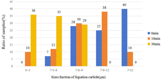 To further investigate the impact of pulsed magnetic field parameters on undissolved carbide, the size distribution of 50 metallographic samples, with each sample taken from an individual steel billet, was statistically calculated using ImageJ JS software. The results of this analysis are subsequently presented in Figure 8. In the absence of the pulsed magnetic field, Figure 8 shows that the size distribution of undissolved carbides (>12 μm) accounts for 40%. When the pulsed magnetic field is applied for 10 min, the size distribution shifts to undissolved carbides (>9–12 μm) at 38%, and with a 30-min application, the size distribution changes to undissolved carbides (0–3 μm) at 36%. Consequently, as the duration of the applied pulsed magnetic field increases, there is a gradual dissolution of undissolved carbides, leading to a more uniform material.