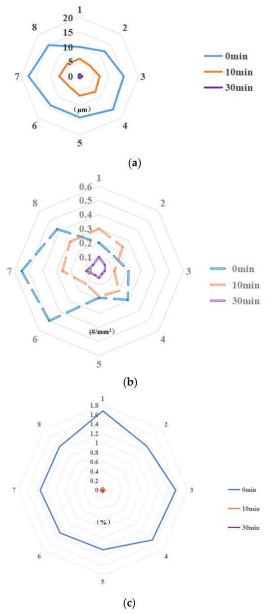 The statistics from the study on the distribution of undissolved carbides in different randomly selected fields of view are shown in Figure 9. This demonstrates that with the addition of the pulsed magnetic field, the average diameter, the number density, and the percentage of the total area of the undissolved carbides in the continuous casting billet have undergone significant changes. Specially, the average size of undissolved carbides decreases from 14.19 μm to 0.63 μm, with a reduction percentage of 96%. Moreover, when the pulsed magnetic field is applied for 30 min, the number density of the undissolved carbides decreases from (0.19~0.55)/mm2 to (0.03~0.1)/mm2, and the percentage area of the undissolved carbides decreases from (1.26~1.68)% to (0~0.02)%.
