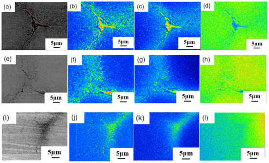 Due to the adverse effects of undissolved carbides, industrial production necessitates extending the residence time of large-grained carbides below the solidus line during homogeneous thermal diffusion treatments before hot working. This approach aims to reduce the segregation of alloying elements. Figure 10 displays the EPMA results for undissolved carbides in GCr15 high carbon chromium-bearing steel after heat treatment at 950 °C, with the application of a pulsed magnetic field. In Figure 10a–d, the morphology and elemental distribution of the undissolved carbide under different conditions of pulsed magnetic field application are illustrated. Figure 10a presents the backscattered electron signal image when the pulsed magnetic field is applied for 0 min during the test. Figure 10a–d reveal a noticeable contrast between the undissolved carbide and the matrix, indicating a clear zone of compositional segregation at the undissolved carbide. In Figure 10b, the mapping-scan distribution of the element C in the undissolved carbide region is depicted, revealing a significant bias of carbon elements towards the undissolved carbide. In Figure 10c, the mapping-scan distribution of the Cr element in the undissolved carbide region is illustrated. It is evident that the distribution position of the Cr element on the undissolved carbide matches that of the C element. In Figure 10d, the mapping-scan distribution of the Fe element in the undissolved carbide region is illustrated. Figure 10e–h depict the morphology and elemental distribution of the undissolved carbide when the pulsed magnetic field is applied for 10 min during the test, while Figure 10i–l show the morphology and elemental distribution of the undissolved carbide when the pulsed magnetic field is applied for 30 min during the test. From Figure 10, it can be deduced that undissolved carbides undergo significant changes with an increase in the applied pulsed magnetic field time during the experiment. Initially, when no pulsed magnetic field is applied, the ratio of the undissolved carbide area to the total microstructure area is 1.68%, with a maximum size of 17.5 μm. After 10 min of pulsed magnetic field, some of the bulk primary undissolved carbides dissolve and disappear, resulting in a reduced undissolved carbide area ratio to the total microstructure area (0.06%) and a decreased maximum size of 4.9 μm. With a 30-min application of the pulsed magnetic field, all bulk primary undissolved carbides dissolve.