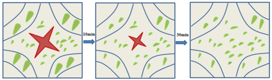 The schematic diagram of the diffusion of undissolved carbide is shown in Figure 12. From the diagram, it is observed that when the pulsed magnetic field is applied, the volume of undissolved carbide at the grain boundary gradually decreases until it disappears.