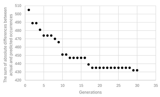 where the sum of absolute differences between actual and predicted occurrences is 432. The model successfully predicted 109 out of 505 cases where defects were found during the ultrasonic examination, which is, compared with logistic regression, 2.87 times better. On the other hand, the same model predicted 86 occurrences of defects where the material was actually not defected. The evolution of the models in the best civilization (i.e., the civilization where the best model occurred) is presented in Figure 2 using the sum of absolute differences between actual and predicted occurrences of defects.