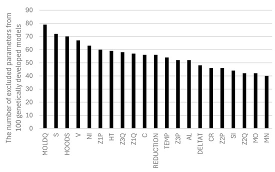 Additionally, it is necessary to emphasize that the genetically developed model does not contain the following parameters: V, C, Z3Q, Z2P, Z1Q, and MOLDQ. Similarly, while checking the other 100 models obtained using genetic programming, it can be concluded that the HOODS (time of cooling of cast billets under hoods) and HT (time of heating of cast billets in the furnace at 650 °C) parameters were each one of top six parameters which were excluded from the developed models. The number of excluded parameters is presented in Figure 3.