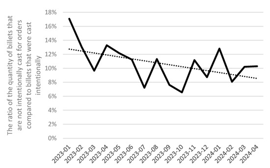 Also, the stock of billets was analyzed. Due to the purposeful use of steel, billets of the same quality of steel must be stored separately for cooling down under hoods or heat treatment, which increases the stock in the steel plant warehouse. Additionally, the quantity of billets that are not intentionally cast for typically small orders increases. Figure 4 shows the decreasing the ratio of the quantity of billets that were not intentionally cast for orders compared to billets that were cast intentionally from January 2023 to April 2024. The ratio of the quantity of billets that were not intentionally cast for orders compared to billets that were cast intentionally decreased from 17.07% to 10.29%. Please note that the average stored quantity of billets from this period to April 2024 is 7161 tons.