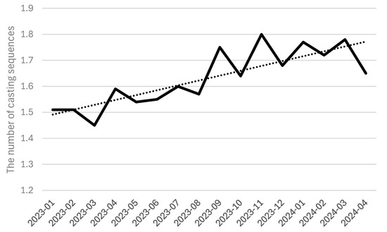 Due to small cooling capacities using hoods (6 hoods × 2 heats) and heat treatment (2 heat treatment furnaces × 2 heats), it was necessary to reduce the number of casting sequences. Figure 5 shows the increased number of casting sequences after abandoning the cooling under hoods and heat treatment of continuous cast billets from January 2023 to April 2024 from 1.51 to 1.63 (by 7.95%).