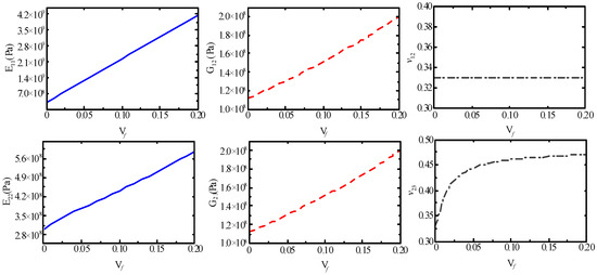 Additional expansion terms in the levels mentioned above have been removed. The expansion coefficient, denoted by A, is solely associated with the geometric characteristics of the fibers. Since the bridging matrix must become the identity matrix when the properties of the matrix and fiber are the same, the constant terms in Equations (1)–(3) in expansion (18) are taken to be 1. Likewise, the constant term in Equation (4) through (5) should take the value of 0.