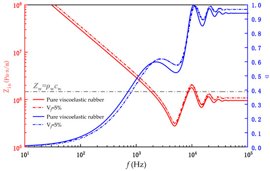 The data from Table 1, Figure 2, and Formula (22) can be used to compute the variation trend of the impedance characteristics of SMA composites with volume fraction, as shown in Figure 4. As increases, the intersection point of the input acoustic impedance of the covering layer also moves toward high frequency, that is, the first absorption peak continuously moves toward high frequency. Therefore, as the volume fraction of SMA continues to increase, the composite material will gradually shift from rubber-based properties to metal-based properties, and the distance between the material and the radiation value will continue to increase in the high-frequency range. Taking the material parameters in Table 1 as an example, when reaches 65%, there is a complete impedance mismatch with seawater, which cannot meet the sound absorption requirements. Therefore, a of 5% was temporarily taken for calculation, and the specific impact of volume fraction changes on the sound absorption performance of the covering layer will be analyzed in the following text.