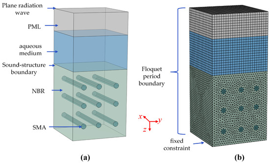 Sound structure fully coupled model of NITi-NBR composite material: (a) geometric model; (b) mesh model.