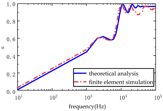 Based on the above theoretical model, the predicted results of MATLAB 2021a theory were compared with finite element simulation, and the corresponding sound absorption coefficients were compared as shown in Figure 6.