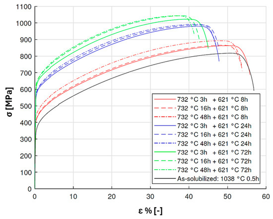 | SA + 732 °C 3 h + 621 °C 72 h | 280 | 616 | 1023 | 47.0 | 57 |