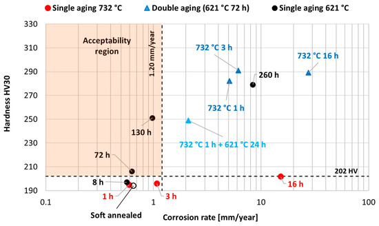 - Single aging at 621 °C for 72 h and 130 h are associated with an acceptable combination of mechanical and corrosion properties. The corrosion resistance is instead not acceptable in the 260 h condition, where the mechanical properties are further improved.