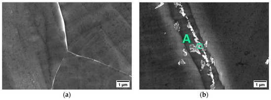 At 621 °C, the precipitation of the hardening phase is faster than that of the intergranular Cr-rich carbides. In fact, according to the TTP diagram of Figure 1, at this temperature, the formation of M23C6 carbides requires longer exposure times compared to 732 °C. This difference was confirmed by the SEM and EDXS analyses performed on the samples aged at 621 °C. The results are reported in Figure 6, Table 4, and Figure 7. In this work, Cr-rich M23C6 carbides were observed at the grain boundaries of the sample aged at 621 °C for 260 h, and they were not detected on shorter exposure times. So, upon aging at 621 °C, it is possible to exploit the precipitation of the hardening intermetallic phase before worsening the corrosion resistance.