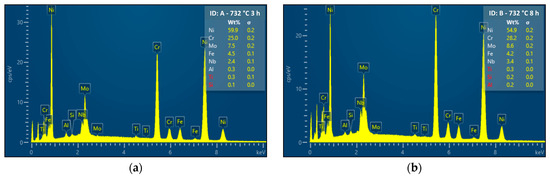 After soft annealing (1038 °C 0.5 h), the age-hardening effect was investigated with isothermal single-aging treatments at both 732 °C and 621 °C for up to 600 h starting from the results of a reduced set of conditions studied in our previous work [17]. The overall set of hardness data at both aging temperatures is reported in Figure 3 [17]. As shown in Figure 3, upon single aging at 621 °C, a steep hardness increase is obtained starting from 72 h. Until such exposure time, the hardness increment with respect to the soft-annealed condition is less than 10%. At 732 °C, the precipitation hardening effect is slightly higher compared to that at 621 °C, at least until the exposure times tested in this work. At 621 °C, a satisfying hardening effect is obtained only after very long exposure times and this behavior can limit its exploitation for most industrial applications. Such very slow age-hardening kinetics is also confirmed by the literature data of Moore et al. and Suave et al. about single aging from 550 °C to 900 °C [8,15,16]. The hardness values of our work are compatible with the literature [15]. The age-hardening phenomenon in this temperature range is determined by precipitation of the phase, as shown in the TTP curves of Figure 1. According to the TTP curves, at these aging temperatures, the formation of intergranular M23C6 carbides can occur together with the intermetallic hardening precipitates. However, compared to the phase, the hardening effect of the M23C6 carbides is negligible [10]. The simultaneous formation of Cr-rich M23C6 carbides was deeply investigated by EDXS analyses performed by scanning electron microscopy. The IDs of the tested positions are reported in Figure 4 and the results of the EDXS analyses are given in Table 3 and Figure 5. At 732 °C, as shown in Table 3 and Figure 4, intergranular M23C6 carbides were not present until 1 h and the onset of their formation was detected in the 3 h sample. This observation is compatible with the literature data based on TEM examinations, as reported in the TTP diagram of Figure 1 [2]. According to the EDXS analyses reported in Table 3, the intergranular M23C6 carbides observed in the samples aged at 732 °C were mainly enriched in chromium, and this is also confirmed by the literature [2,9,10]. The formation of such carbides is expected to be significantly detrimental to the corrosion resistance.
