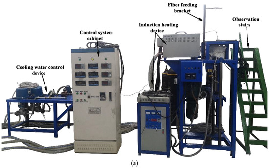 The equipment includes a cooling water control device, a continuous casting traction device, an induction heating device, and a fiber rotating device, as shown in Figure 1. The cooling water control device of the crystallizer is provided with water pressure by the water pump, and the magnetic control valve controls the water flow; the range is 100–1000 L/h. The continuous casting traction device is composed of a three-phase asynchronous motor, a reducer, and a lead screw, used to obtain a stable drawing speed; the speed range is 5–100 mm/min. The induction heating equipment provides metal melting and continuous casting temperatures with a temperature deviation of ±5 °C. Some PID control instruments, placed in the control cabinet to display and control the cooling water intensity and melt temperature, were heated by an induction heating device. The fiber rotation device is used to make the fiber rotate smoothly into the molten metal. Melting temperature was measured with a K-type thermocouple protected by a ceramic tube. The observation stairs are used to easily observe the operation of the experimental equipment.