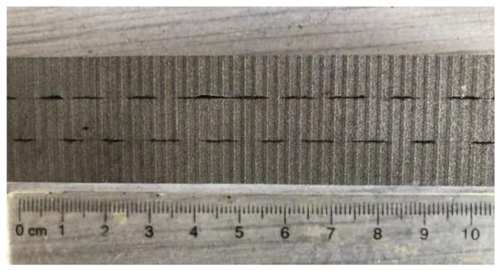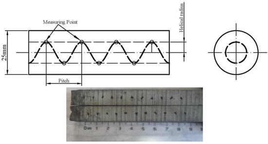The sample with a diameter of 25 mm was equally divided into four parts along the axial direction, as shown in Figure 3. The distance between adjacent measurement points is the pitch of the helical fiber, and the distance between the measurement point and the centerline of the bar is the helical radius of the helical fiber in composites.