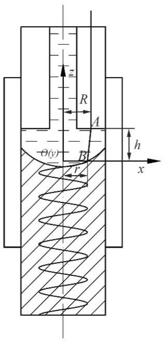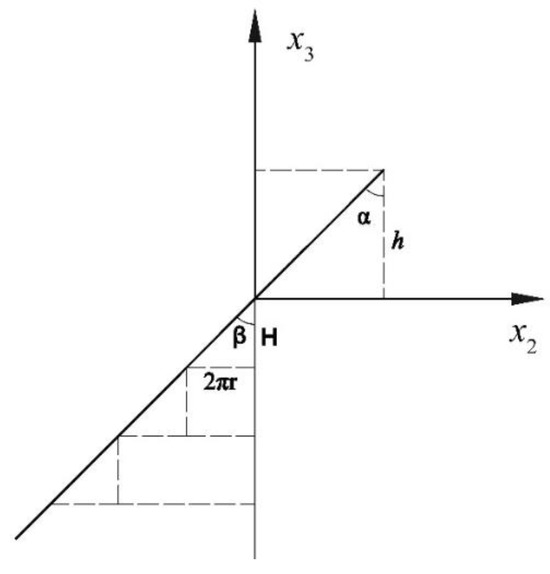 At first, the cooling intensity of the crystallizer is uniform, that is, the liquid–solid interface is rotationally symmetrical around the z-axis. If it is not, the radius of the helical shape will be unstable. Secondly, during continuous casting, the melt temperature was stable, but the fluctuation in the position of the solid–liquid interface was neglected. The continuous casting speed is low, the liquid–solid interface is close to the plane, and the concave shape of the liquid–solid interface is ignored. At any radial position, h is the constant value. Thirdly, during continuous casting, the tension on fiber is stable, that is, the solidification and bonding process of the fiber and the metal is stable. The fiber is straightened in molten metal. Excessive tension causes the bonding point to be pulled away. On the contrary, the fiber in the molten metal is in a relaxed and bent state.