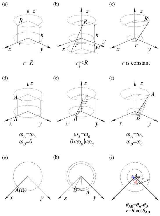 In the initial state of continuous casting, the fiber does not start to rotate. The height of the liquid–solid interface h formed in the crystallizer is stable. Since the fiber is fixed on the tow bar with radius R off-axis, the radius of the fiber in the metal matrix is the same as the fiber rotation radius R. The rotation to add the fiber bar and the tow bar is shown in Figure 5; and correspond to points A and B in Figure 6d, respectively. When the fiber starts to rotate counterclockwise, only the speed of the fiber rotation point A is , and the speed of the fiber–metal bonding point B is zero. In the top view, the fiber rotation point A and the fiber–metal bonding point B are the same point, as shown in Figure 6a,d,g.