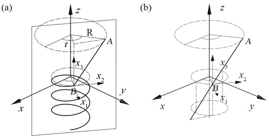 When taking the horizontal plane where the fiber and the solidified metal bond point are the O-xy plane of the 3D space cartesian coordinate system, the central axis of the continuous casting rod is the z-axis direction, the origin is the intersection of the O-xy plane and the z-axis, and a 3D space cartesian coordinate O-xyz was established, as shown in Figure 4. The fiber rotates around the z-axis with a radius of R to form the fiber rotation plane. Under the condition that the process parameters remain unchanged, the distance between the O-xy plane and the plane of the rotation of the fiber in the matrix remain stable, recorded as the height of the liquid–solid interface h in this paper. A and B are the fiber rotation point and the metal bonding point, respectively. r is the helical radius of the helical carbon fiber in the solidified metal matrix.