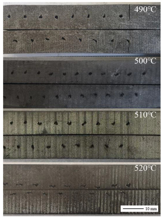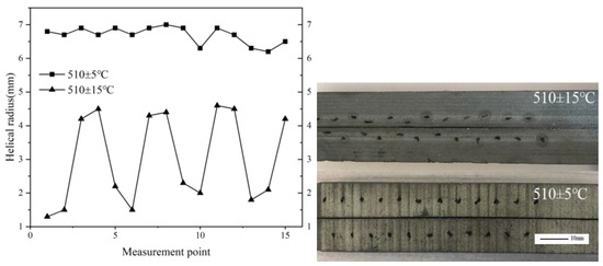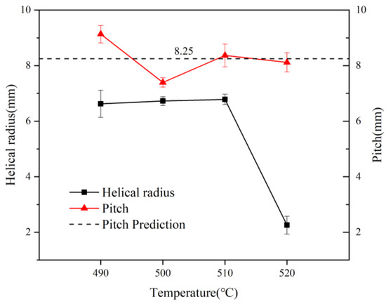 The effect of the melt temperature (from 490 to 520 °C) on the helical carbon fiber shape (helix radius and pitch) in lead matrix composites is shown in Figure 10. When the melt temperature was increased from 490 to 520 °C, the helical radius of the carbon fiber in the lead matrix showed a downward trend. However, when the melt temperature is in the range of 490 to 510 °C, the change in the helix radius is not obvious. When the melt temperature rises to 520 °C, the helical radius decreases significantly, as shown in Figure 11. The pitch is basically the same as the predicted value of the process model, and the difference is mainly caused by measurement errors. Since the liquid–solid interface’s height needs to be measured experimentally, the predicted value of the helical radius is not given in the figure.