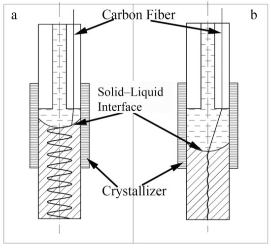 According to the above process model, the shape stability of the helical carbon fiber in the helical carbon fiber-reinforced lead matrix composites is mainly affected by the state of the liquid–solid interface. The state of the liquid–solid interface mainly includes the symmetry and height stability of the liquid–solid interface. The symmetry of the liquid–solid interface is mainly related to the cooling uniformity of the crystallizer. The height stability of the liquid–solid interface is mainly related to the stability of the melt temperature and continuous casting speed.