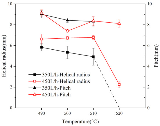 At the same melt temperature, the height of the liquid–solid interface increases with the cooling intensity, and the process parameter h decreases, according to Equation (8). The helix radius increases with its height. The pitch hardly changes with the cooling intensity. This is consistent with the process model.