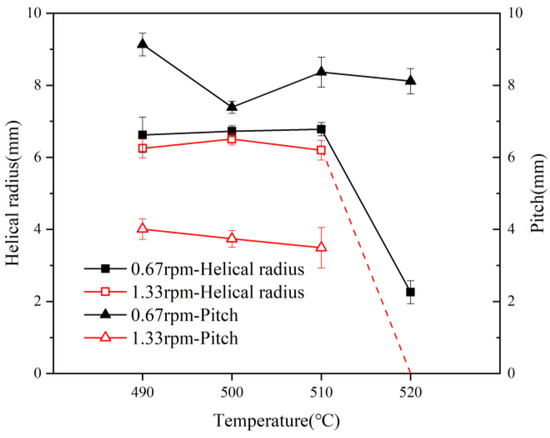 The effect of fiber rotation speed (from 0.67 to 1.33 rpm) on the shape (helix radius and pitch) of carbon fiber-reinforced lead matrix composites, as shown in Figure 14. At the same melt temperature, the helical radius decreases with increasing fiber rotation speed. The pitch also decreases significantly with increasing fiber rotation speed, almost 1/2 of the former, as shown in Figure 15. This is consistent with the proportional relationship between the fiber rotation speed and the pitch in the process parameters model.