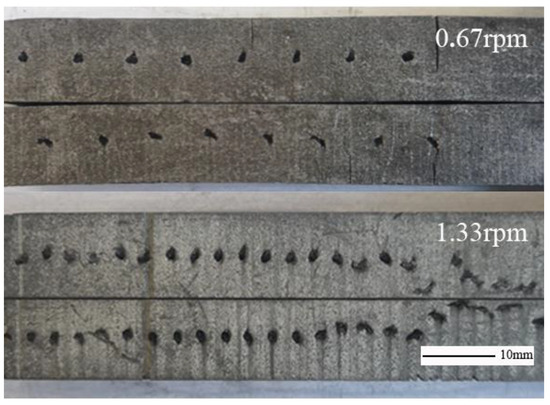 According to the above model analysis, when the carbon fiber forms a stable helical shape on the lead base, the angle difference between the addition point A of the carbon fiber and the helical formation point B will remain unchanged, as shown in Figure 6i, that is, after one rotation of the carbon fiber, the helical fiber forms one cycle in the matrix. With the continuous casting speed remaining constant, there is a linear relationship between the fiber rotation speed and the helical pitch, as shown in Equation (9).