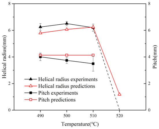 The process parameter h can be calculated at each temperature. When the fiber rotation speed increased to 1.33 rpm, substituting it into Equation (8) obtained the predicted value of the helical radius at each temperature under the process conditions compared with the experimentally measured value, as shown in Figure 16. The deviation between the experimental value and the predicted value of the helical radius is at most 7.2%. Thus, the process model can accurately predict the helical shape of the helical carbon fiber of the composites through the process parameters.