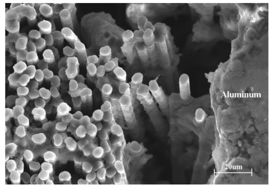 Figure 18 shows the SEM of the aluminum matrix and carbon fiber of the helical carbon fiber-reinforced aluminum matrix composites. Through observation, it can be found that the carbon fiber bundle is not completely impregnated by the aluminum matrix, as there are holes, and the carbon fiber is not fully combined with the aluminum matrix. This is mainly because the wettability between the carbon fiber and the molten aluminum is poor under normal pressure.