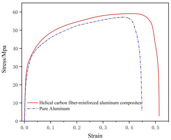 The stress–strain relationship between helical carbon fiber-reinforced aluminum matrix composites and pure aluminum is shown in Figure 19. It shows that the tensile strength and elongation of the composites were 57 MPa and 52%, and that the tensile strength and elongation of the pure aluminum were 53 MPa and 45%. The tensile strength of the composites is 7.5% higher than that of pure aluminum, and the elongation of the composite material is 15.6% higher than that of pure aluminum.