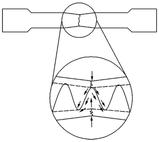 The schematic diagram of crack growth during tensile testing of the helical carbon fiber-reinforced aluminum composites.