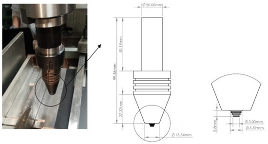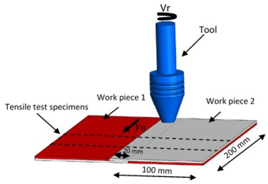 This tool had a cylindrical threaded shape with a 20 mm diameter, a 6 mm pin diameter, and a left-threaded cylindrical pin profile with a 1 mm pitch (Figure 2). The tool was tilted backwards by 2°.