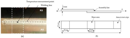 Moreover, tensile tests were performed using a Galdabini QUASAR 50 (Cardano al Campo, Italy) following the ASTM E8 standard [24] on lap joint samples of 2 mm thickness for each part, as depicted in Figure 5. During these tensile tests, a constant tensile test speed of 1.3 mm/min [25] was selected. Firstly, the lap joint was securely fixed or clamped to ensure stability during the extraction process. Then, a cutting tool, i.e., a water jet cutting machine, was used to precisely cut through the joint, separating it into individual specimens. Care was taken to ensure that the specimens were extracted in a manner that preserved their integrity and dimensions, minimizing any potential distortion or damage to the weld zone.