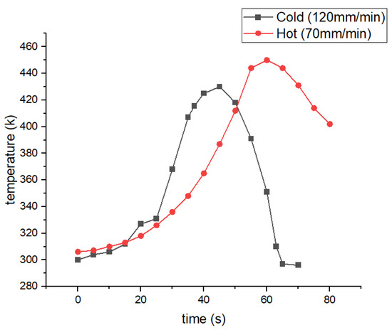 As shown in Figure 6, the temperature increases more quickly during cold welding as a result of the increased welding speed, reaching a value of about 433 K in approximately 50 s. However, in the case of hot welding, the peak temperature of almost 450 K was reached in more time, approximately 60 s. These results resemble those obtained by Nandan et al. [26]. In this last case, the higher value of peak temperature is due to the lower welding speed allowing for more residence time, which results in more friction interaction between the pieces and the tool and then providing more heat flux, as explained by Verma and Misra [27].