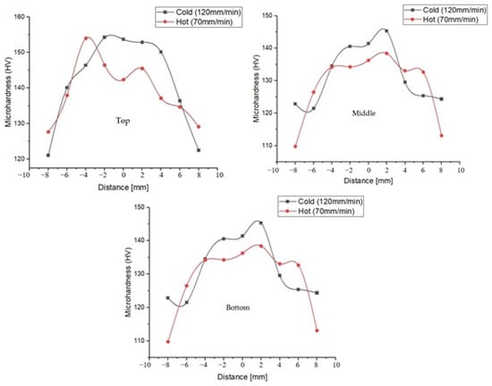 As shown in Figure 7, it is evident that the variation in the welding speed influenced the hardness values. Irrespective of the welded joint region, the hardness increased with the welding speed increase. At low welding speeds, higher temperatures are reached, and larger grains are obtained, leading to lower hardness levels. However, at high welding speeds, lower temperatures are attained, resulting in smaller grains and higher hardness levels. The same explanation was given by Kumar et al. [30]. In the top zone, the peak values were detected on the left hand side due to the intensity of the forces involved in this area, while the advancing side was generally less hard due to the relatively less intense interaction with the welding tool. In the middle zone, the curves exhibited twin peaks, indicating areas of localized hardness due to the combined effects of heat and mechanical deformation during the welding process. In the bottom zone, the peak values shifted to the right.