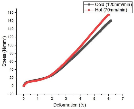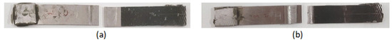 Tensile strength tests were conducted using the Galdabini QUASAR 50, a universal testing machine. As mentioned previously, the samples were extracted from welds executed using different welding speeds. Figure 8 presents an example of fractured tensile specimens for cold and hot welding.