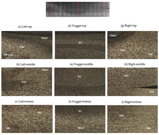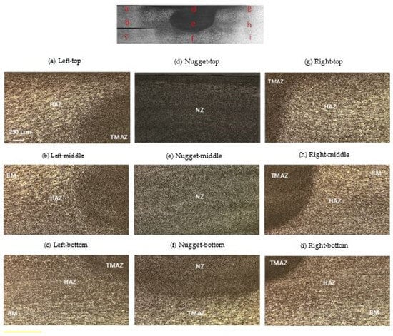 The micrographs in Figure 13 depict a trend where grain sizes tend to increase as the advancing speed of the tool decreases. In the heat-affected zone (HAZ) and in the thermomechanical-affected zone (TMAZ), where grains are solely influenced by heat, larger grains are observed with a mean size ranging from 68 µm to 79 µm. This phenomenon can be attributed to the substantial deformations caused by the mechanical effect of the tool at elevated temperatures during welding, as elucidated by Aliha et al. [38].
