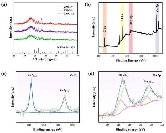 (a) XRD patterns of the as-prepared samples. (b) XPS full scan spectra, (c) Zn 2p, and (d) Mn 2p spectra of ZnMn2O4.
