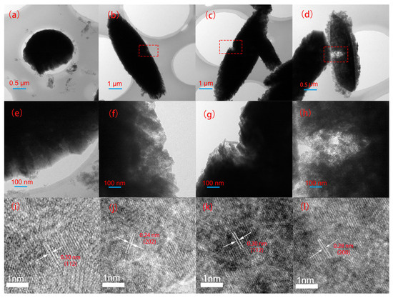 TEM images of ZnMn2O4 with different hydrothermal reaction times: hydrothermal reaction time of 7 h (a,b,e,f,i,j), 9 h (c,g,k), and 12 h (d,h,l).