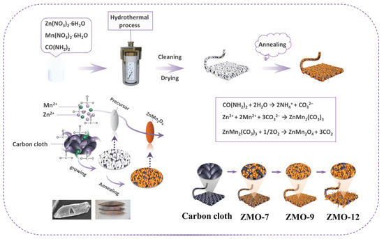 Among carbon materials, carbon cloth possesses unique ductility and flexibility as a conductive textile [9]. Therefore, carbon cloth has received a lot of research attention in wearable applications. The direct deposition of TMOs on carbon cloth can prevent the agglomeration of TMOs and avoid the participation of binders, achieving excellent specific capacitance for supercapacitor electrode materials [10,11,12]. As one of the most popular materials in the field of energy research, ZnMn2O4 with a unique AB2O4 spinel structure has high theoretical specific capacitance, low potential, abundant natural reserves, and multiple oxidation valence states of manganese [13,14]. Based on the above advantages, ZnMn2O4 is considered one of the most promising TMOs in the field of electrode materials. However, the application of ZnMn2O4 as an electrode material has been more focused on lithium-ion batteries [15,16,17]. In the process of charge and discharge cycles of lithium batteries, the ZnMn2O4 electrode has low conductivity, serious volume expansion, easy powdering, and other problems [18], which limit its further development and application in the field of batteries. At the same time, there are few studies on ZnMn2O4 as an electrode material for supercapacitors, and these studies have focused on the preparation of ZnMn2O4 nanoparticles. The electrochemical performance of ZnMn2O4 electrode materials can be improved by adjusting the structure of ZnMn2O4 nanoparticles [19]. However, the methods for improving the electrochemical performance of supercapacitor electrode materials by regulating the structure of ZnMn2O4 nanoparticles are seldom studied deeply.