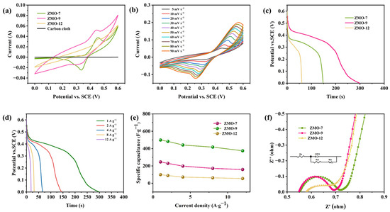 (a) CV curves at the scan rate of 5 mV·s−1. (b) CV curves of the ZMO-9 electrode at a scan rate of 5 mV·s−1 to 90 mV·s−1. (c) GCD curves at a current density of 1 A·g−1. (d) GCD curves at different current densities of the ZMO-9 electrode. (e) Comparison of the specific capacitance change. (f) The fitting EIS curves of the ZMO-7, ZMO-9 and ZMO-12 electrodes.