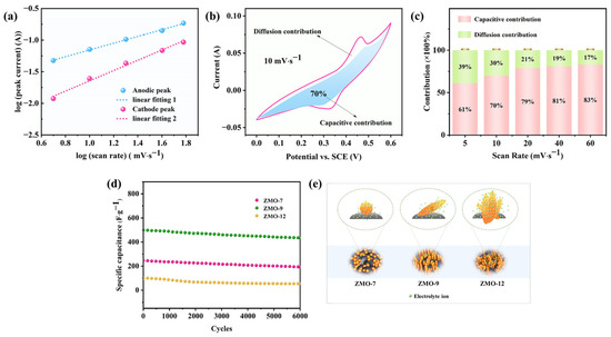 where i and υ are the redox peak current and corresponding scan rate, respectively. In Figure 6a, the value of log a can be confirmed from the horizontal intercept, and the value of b can be calculated from the slope of the fitting straight line. It is worth noting that if the value of b is 0.5, then the electrochemical kinetics reaction of the electrode is a diffusion-controlled process. If the value of b is 1, it indicates a surface faraday redox reaction. A value of b between 0.5 and 1 is related to the diffusion and surface control process of an electrode [46]. Therefore, the b values of the ZMO-9 electrode are calculated to be 0.55 and 0.83, respectively. The results indicate that the dominant charge storage mechanism of the ZMO-9 electrode is a mixed surface faradaic redox reaction mechanism with the battery mechanism. Hence, the CV and GCD curves of the ZMO-9 electrode show remarkable characteristics of battery-like materials. In addition, the capacitive contribution and the diffusion contribution can be determined quantitatively by calculating their respective proportions as follows: