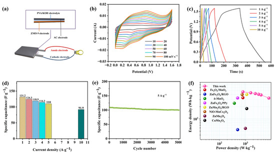 (a) A schematic diagram of the ZMO-9//AC device. (b) CV curves of the ZMO-9//AC device with scan rates ranging from 10 to 100 mV·s−1. (c) GCD curves at various current densities. (d) The specific capacitance at various current densities. (e) The cycling stability of the ZMO-9//AC device. (f) The energy and power densities of the ZMO-9//AC device and other devices [39,50,51,52,53,54,55,56].